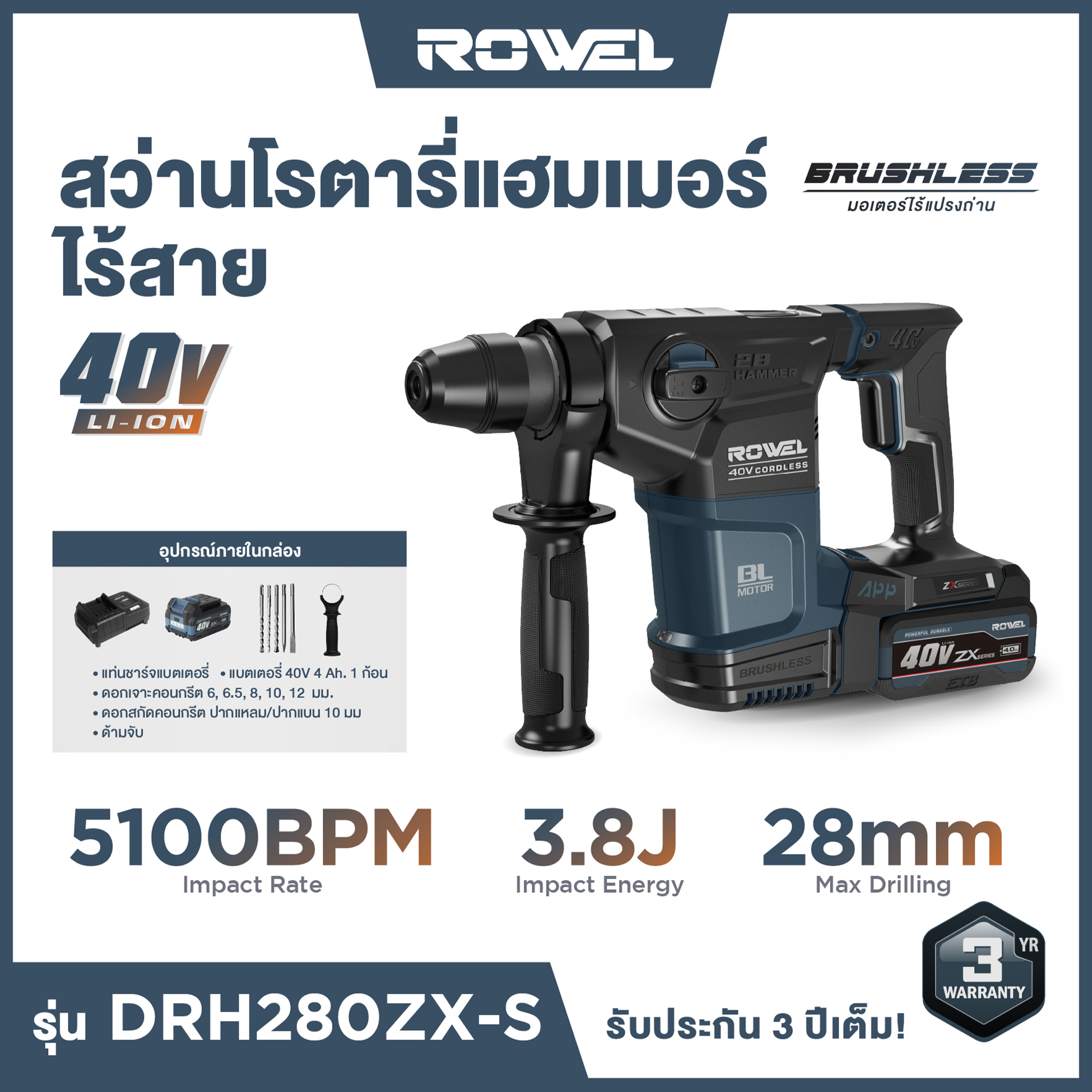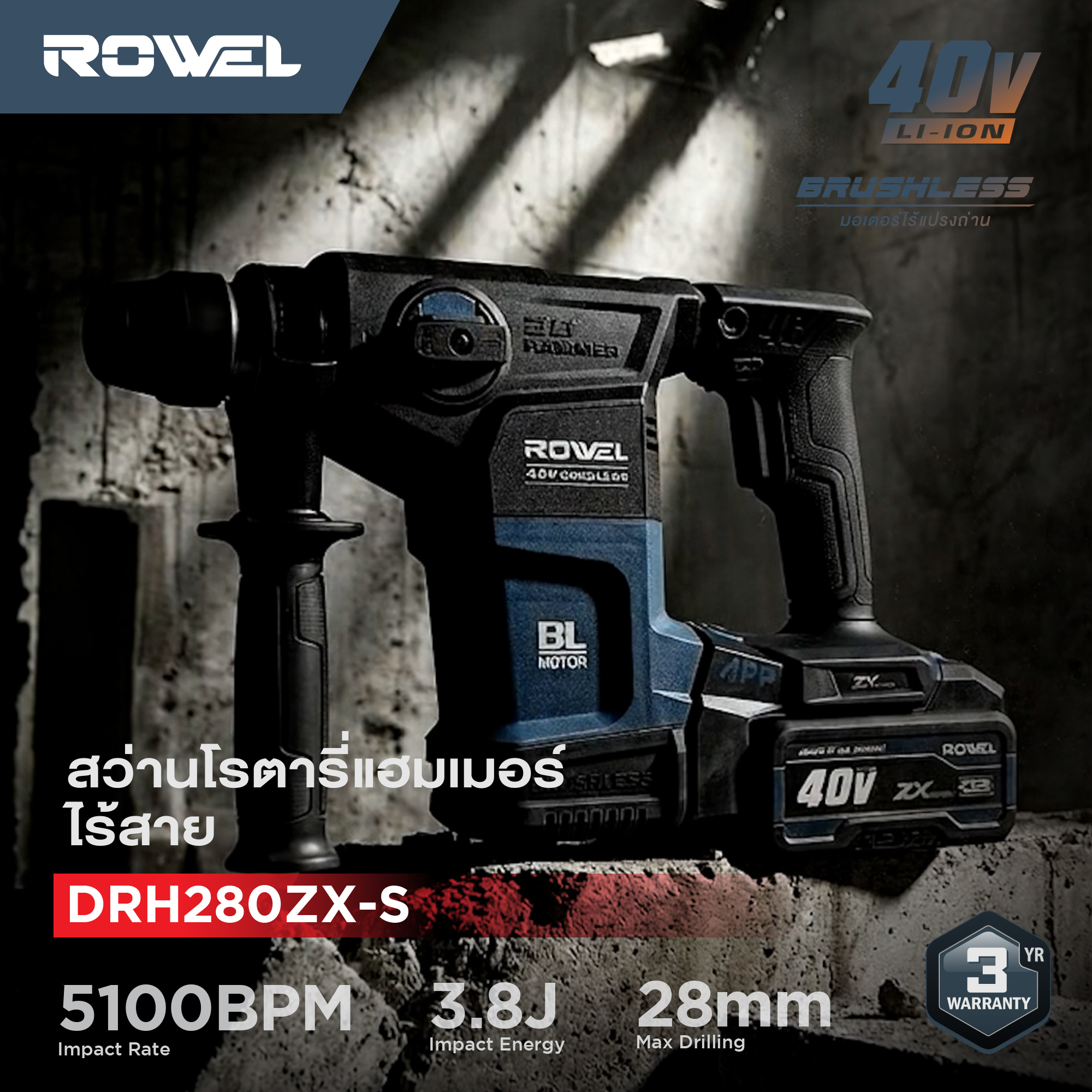 สว่านโรตารี่แฮมเมอร์ไร้สาย ROWEL รุ่น DRH280ZX-S รุ่นเรือธงใน ZX Series พลังสูงระดับงานมืออาชีพ มาพร้อมแบตเตอรี่ 40V Li-ion และ มอเตอร์ไร้แปรงถ่าน (Brushless Motor) ให้กำลังแรง ประสิทธิภาพสูง อายุการใช้งานยาวนาน และประหยัดพลังงานมากขึ้น