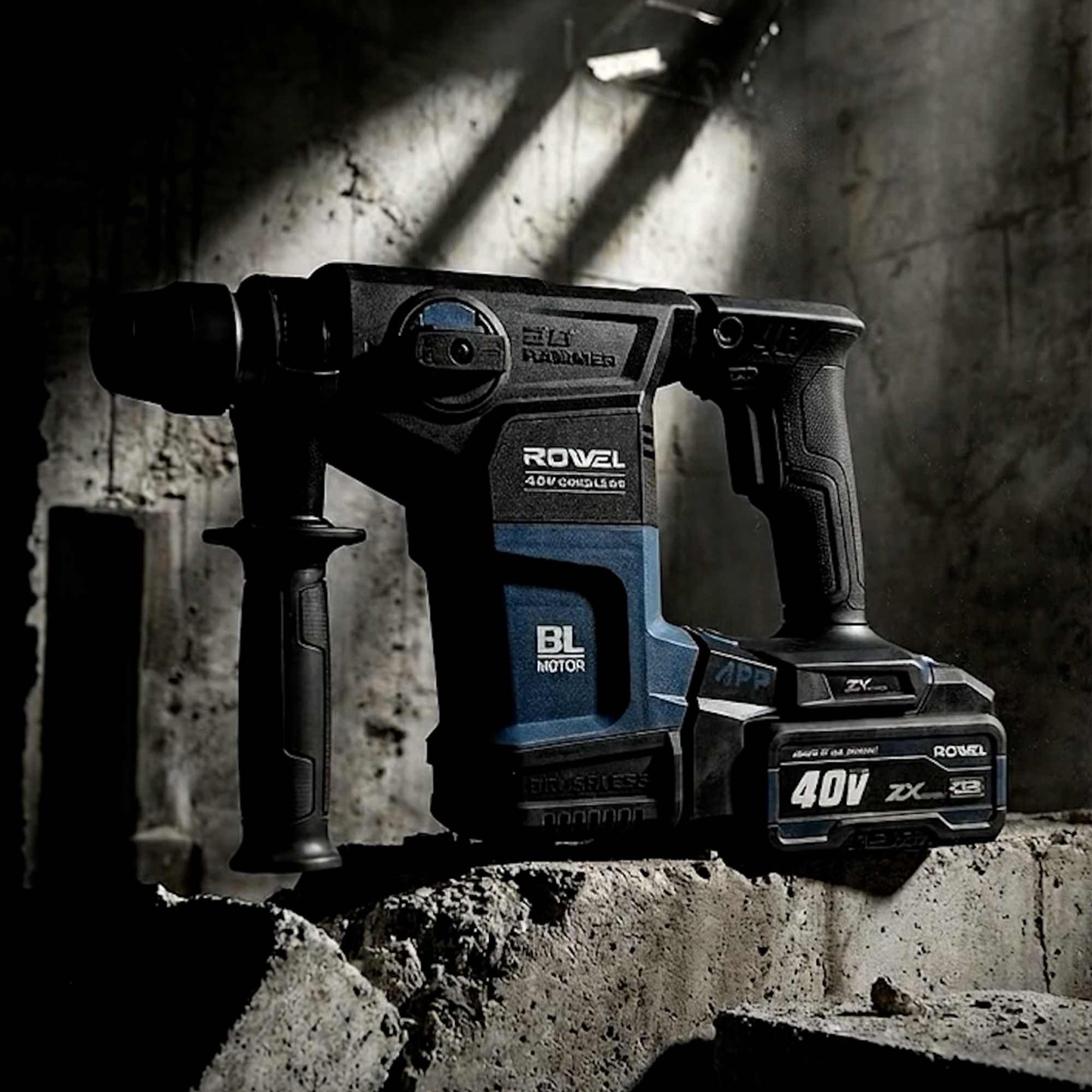 สว่านโรตารี่แฮมเมอร์ไร้สาย ROWEL รุ่น DRH280ZX-S 40V มอเตอร์ไร้แปรงถ่าน (Brushless) แรงกระแทก 3.8 จูล เจาะคอนกรีตได้สูงสุด 28 มม. อัตราการกระแทก 5,100 BPM พร้อมระบบ Anti-Kickback และ Dual Anti-Vibration ใช้งานหนักได้อย่างมั่นใจ