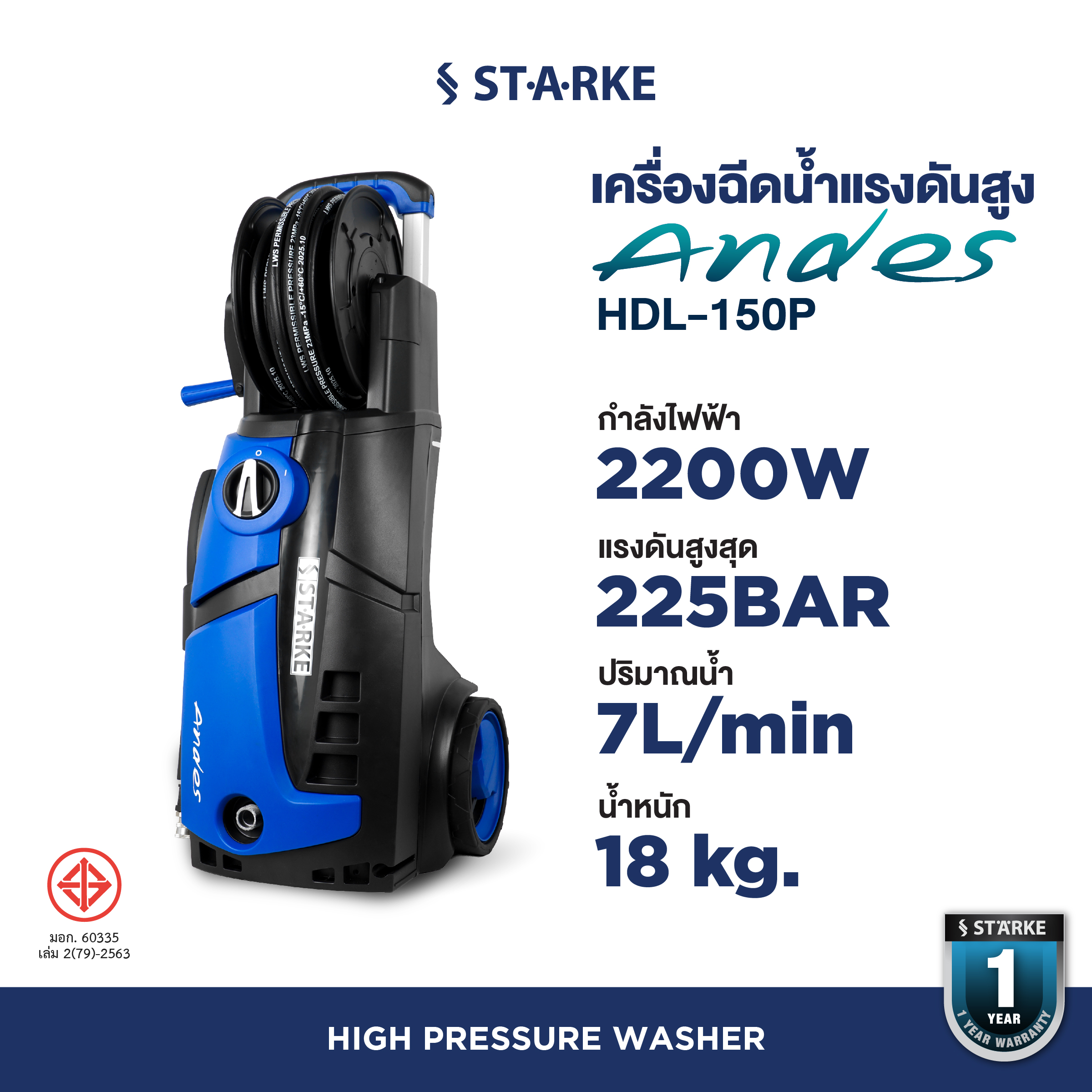 เครื่องฉีดน้ำแรงดันสูง 225 bar 2200W รุ่น HDL-150P จากแบรนด์ STARKE ออกแบบมาเพื่อรองรับงานทำความสะอาดที่ต้องการแรงดันสูงเป็นพิเศษ เช่น ล้างรถยนต์ รถบรรทุก พื้นปูน คราบฝังแน่น คราบน้ำมัน หรือสิ่งสกปรกที่เกาะแน่น ตัวเครื่องให้แรงดันสูงสุดถึง 225 บาร์ และแรงดันขณะใช้งาน 150 บาร์ (+10%) ช่วยให้ทำความสะอาดได้รวดเร็ว ประหยัดเวลาและแรงงาน