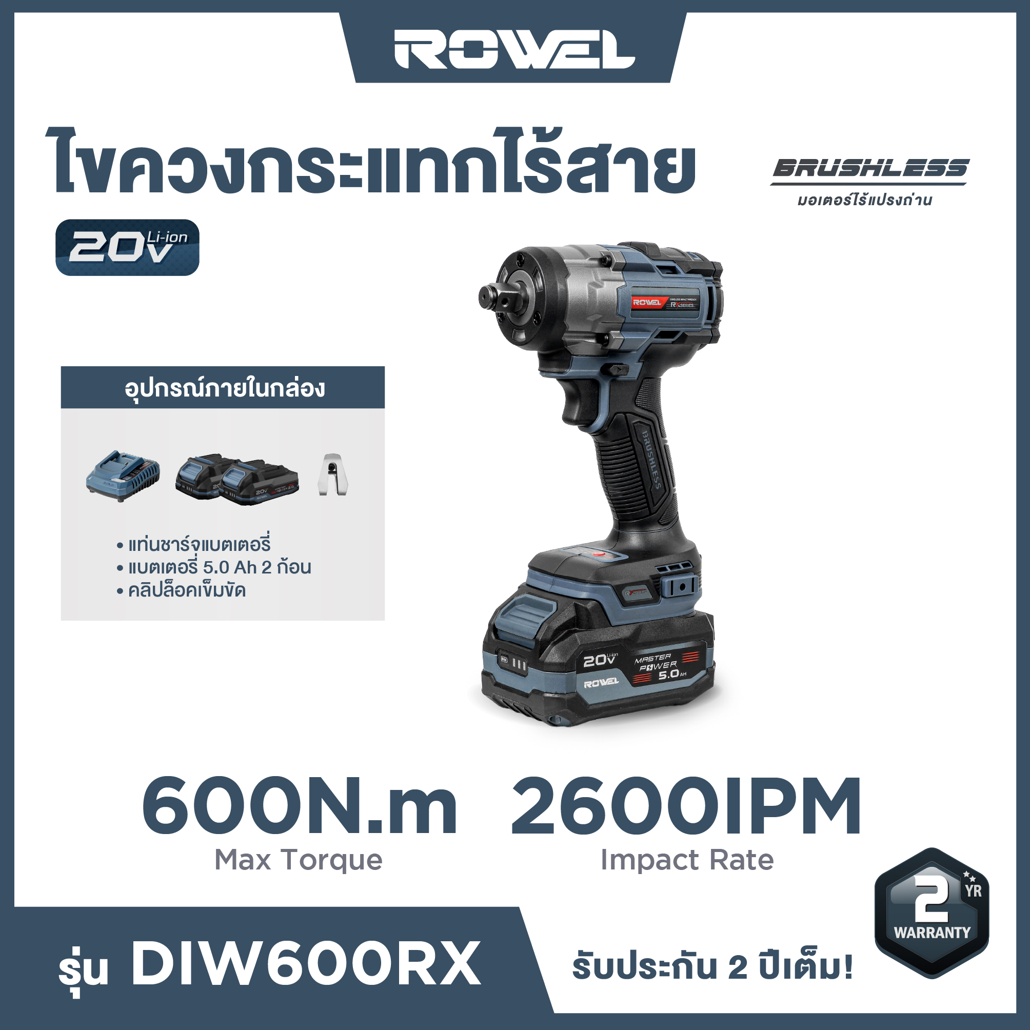 บล็อกกระแทกไร้สายระบบแบตเตอรี่ 20V Li-ion ROWEL รุ่น DIW600RX  มอเตอร์ Brushless ให้พลังแรง ทนทาน และประหยัดพลังงาน เหมาะสำหรับงานขันน็อต งานซ่อมรถ งานโครงสร้าง และงานอุตสาหกรรมที่ต้องการแรงบิดสูงเป็นพิเศษ ให้แรงบิดสูงสุดถึง 600 นิวตันเมตร รองรับงานหนักได้อย่างมั่นใจ