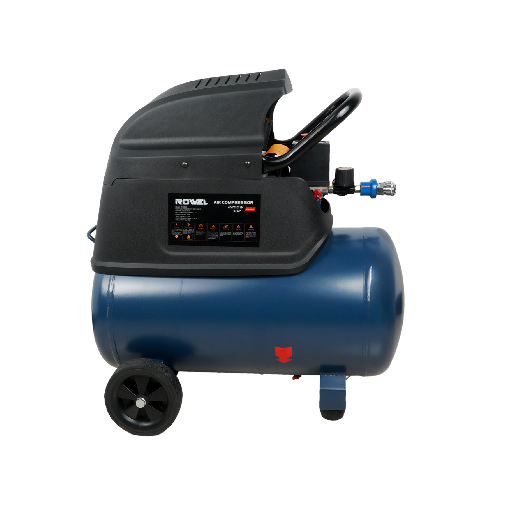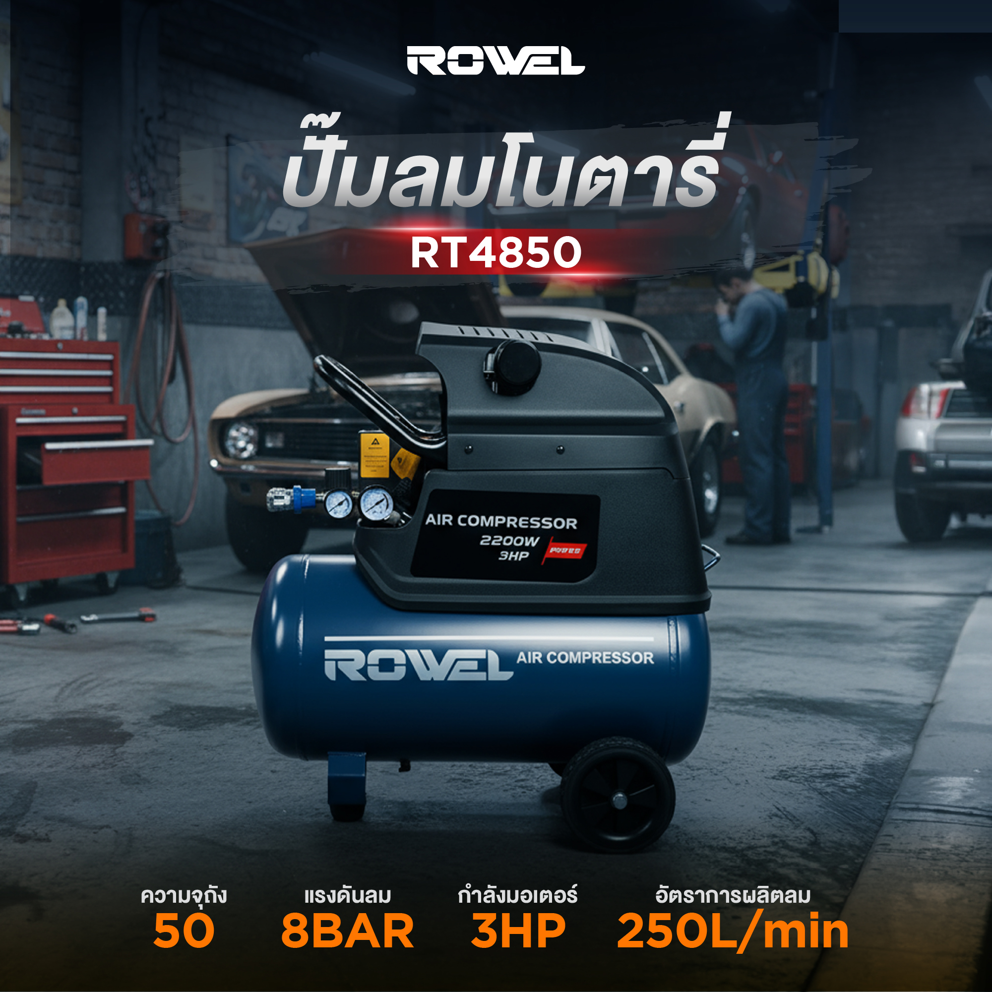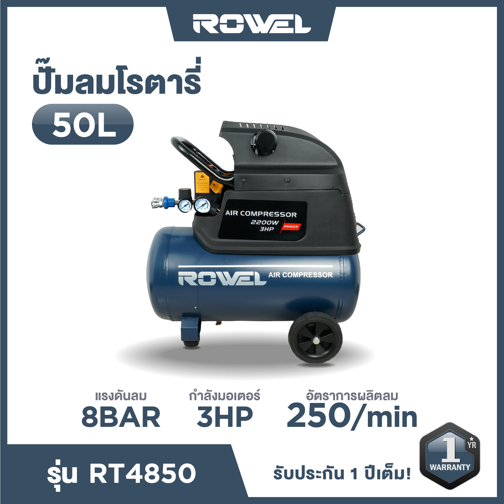 ปั๊มลมโรตารี่ ROWEL รุ่น RT4850 ขนาดถัง 50 ลิตร มอเตอร์กำลัง 3 แรงม้า ให้แรงดันลมสูงสุด 8 บาร์ เหมาะสำหรับงานช่างทั่วไป งานพ่นสี เป่าฝุ่น เติมลม และงานอุตสาหกรรมเบา