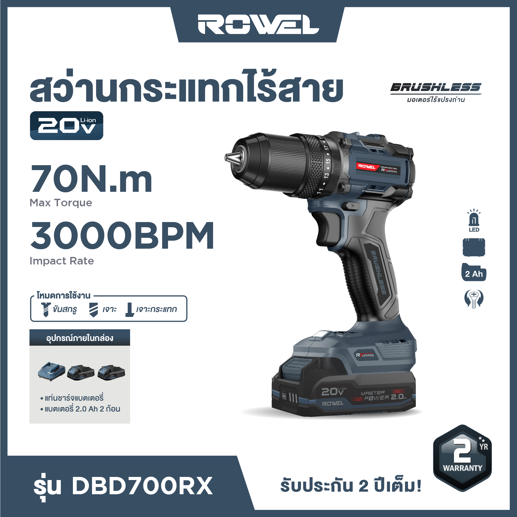สว่านกระแทกไร้สาย 20V 70Nm. RX serie พร้อม แบตเตอรี่ 2.0 Ah x 2 Rowel รุ่น DBD700RX