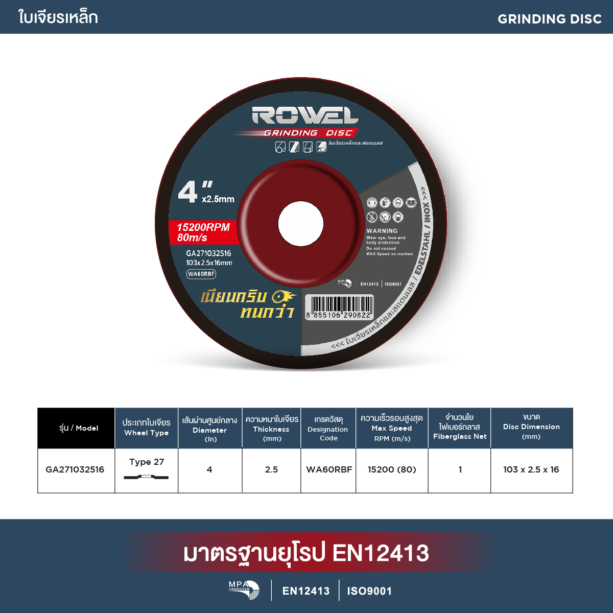 ใบเจียรไฟเบอร์กลาสขนาด 100 มม. Rowel รุ่น GA271006016 ที่ผลิตจากวัสดุคุณภาพสูง มาพร้อมโครงสร้าง Type 27 และหนาใบตัด 6 มม. ให้การตัดที่แม่นยำและคงทน เหมาะกับงานโลหะและวัสดุต่าง ๆ สำหรับงานประจำวันและงานอุตสาหกรรม