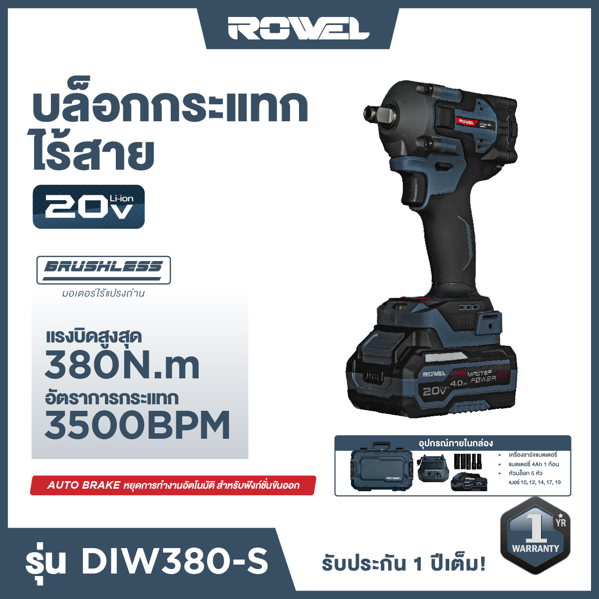 ตัวช่วยในการขันและคลายนอตอย่างสะดวก ด้วยบล็อกกระแทกไร้สาย RW-PT-DIW380-S มอเตอร์ไร้แปรงถ่าน กำลังไฟ 20 โวลต์ แรงบิดสูงสุด 380 Nm หัวจับดอก 12.7 มม. สำหรับใช้งานร่วมกับลูกบล็อก เพื่อขันหรือคลายนอตและสกรูที่ติดแน่นอย่างรวดเร็ว เหมาะสําหรับงานหนัก เช่น ซ่อมรถหรือก่อสร้าง มาพร้อมระบบเบรกไฟฟ้า ใช้งานได้อย่างสะดวก ตัวเครื่องที่ไร้สาย ทำให้หมดปัญหาเรื่องสายไฟพันกันขณะใช้งาน เพิ่มความสะดวกสบายในการเคลื่อนย้าย และง่ายต่อการจัดเก็บ