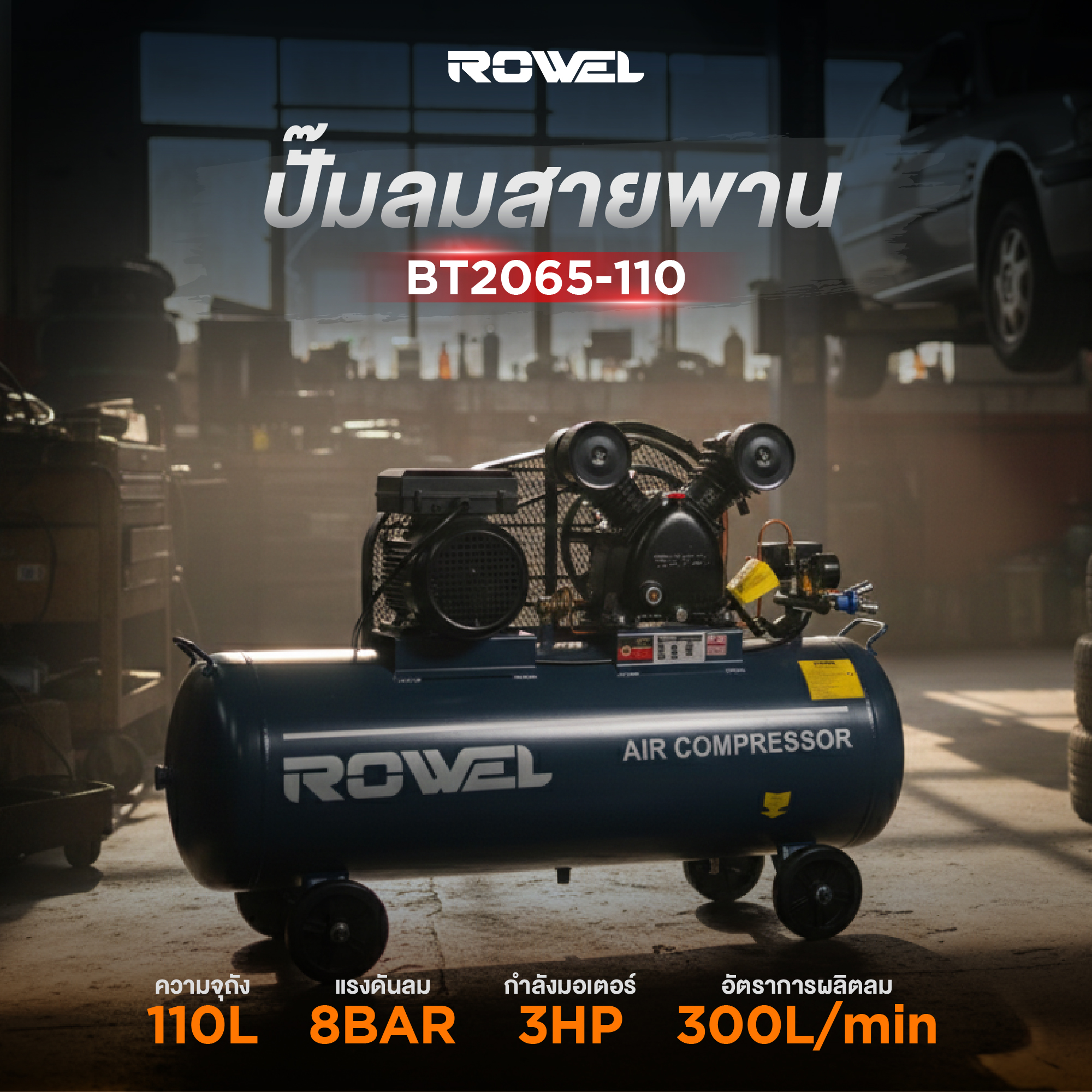 ปั๊มลมสายพาน ROWEL รุ่น BT2065-150 ขนาดถัง 150 ลิตร มาพร้อมมอเตอร์กำลัง 3 แรงม้า (3 HP) ให้แรงดันสูงสุด 8 บาร์ และอัตราการผลิตลม 300 ลิตร/นาที เหมาะสำหรับงานหนักต่อเนื่องในอู่ซ่อมรถ งานซ่อมบำรุง โรงงาน และงานอุตสาหกรรมขนาดย่อม ระบบขับเคลื่อนด้วยสายพานช่วยลดรอบการทำงานของมอเตอร์ ทำให้เครื่องทำงานเงียบขึ้น ทนทาน อายุการใช้งานยาวนาน