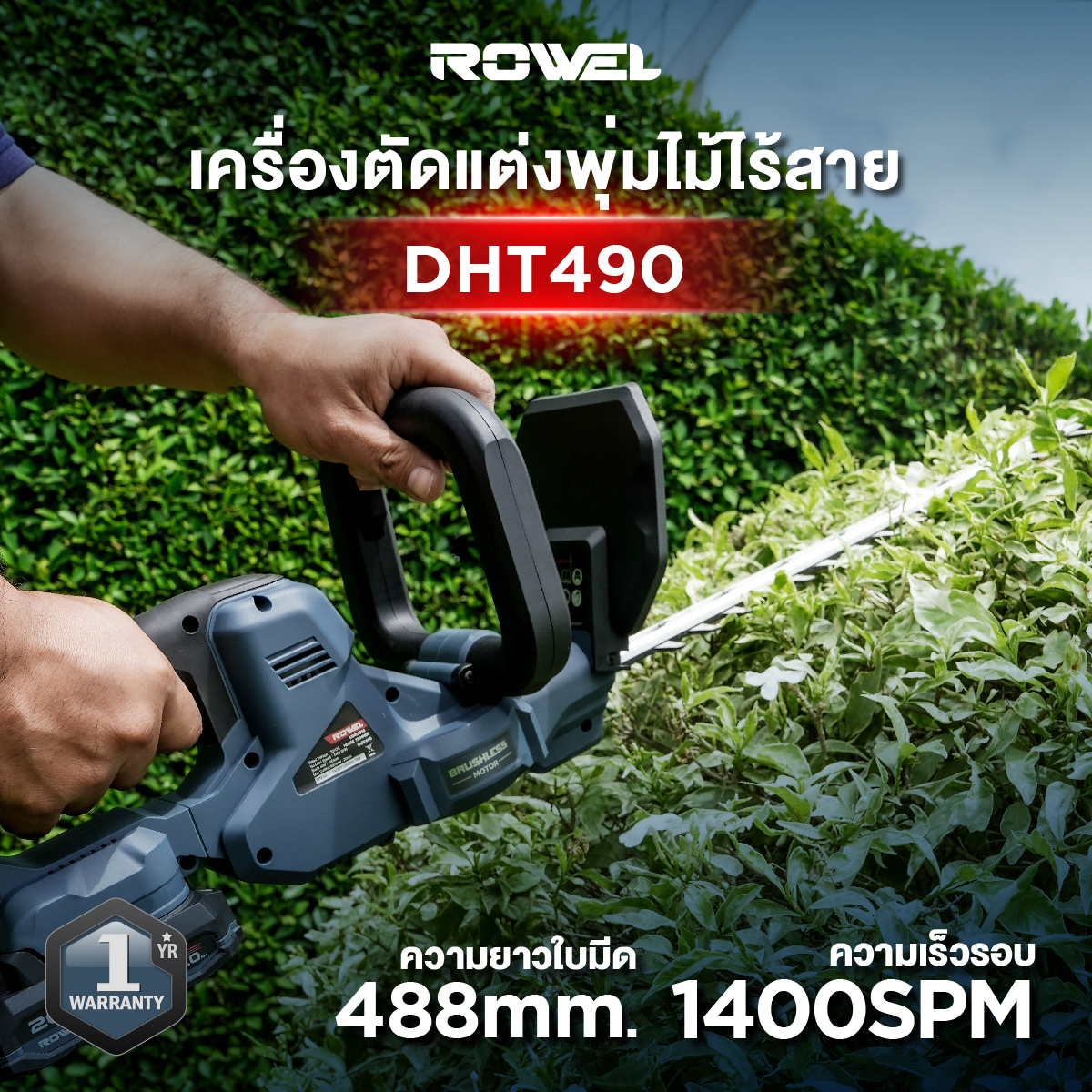 ตัดแต่งพุ่มไม้ให้สวยเรียบง่าย ด้วย ROWEL DHT490 มอเตอร์ Brushless ใบมีดยาว ตัดคม ใช้งานสะดวก พร้อมระบบความปลอดภัย